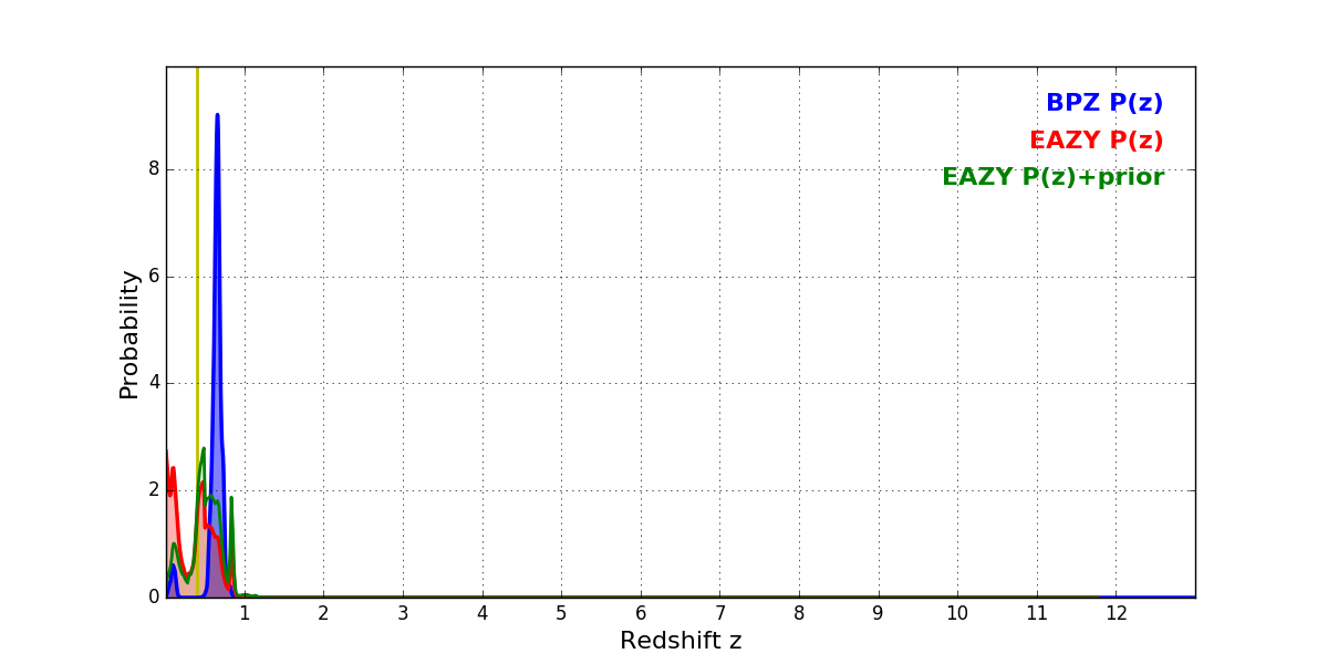 In P(z) plots: Yellow lines mark the cluster redshift z = 0.396,