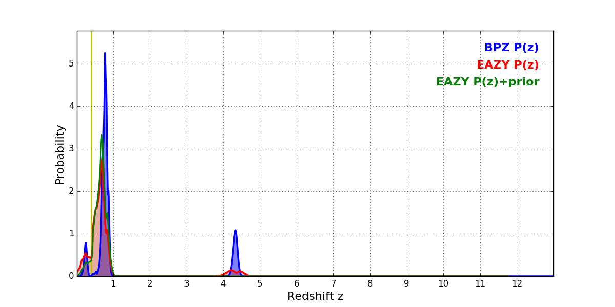 In P(z) plots: Yellow lines mark the cluster redshift z = 0.396,