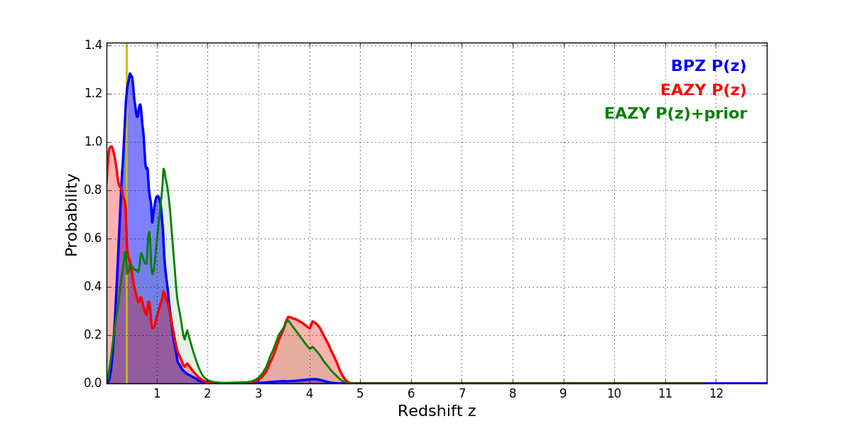 In P(z) plots: Yellow lines mark the cluster redshift z = 0.396,