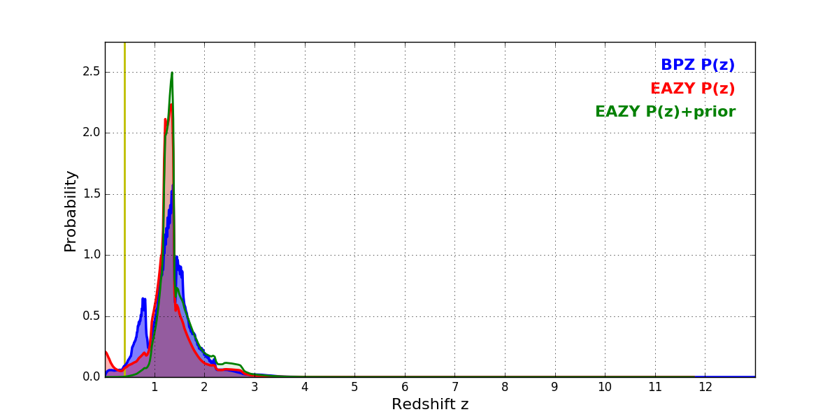 In P(z) plots: Yellow lines mark the cluster redshift z = 0.396,
