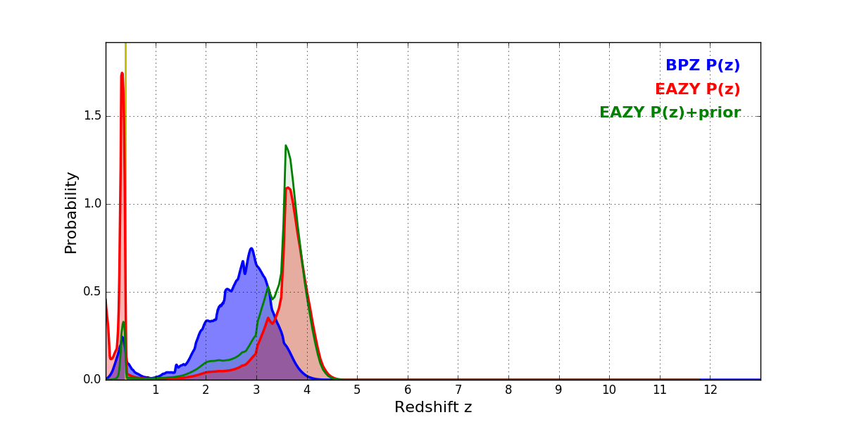 In P(z) plots: Yellow lines mark the cluster redshift z = 0.396,