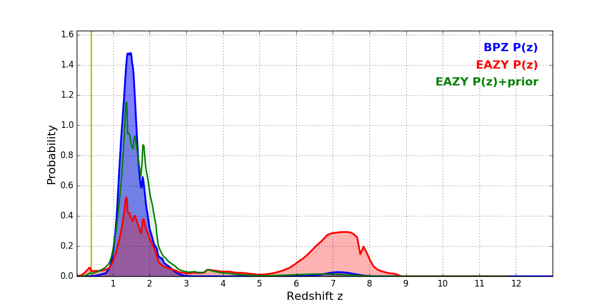In P(z) plots: Yellow lines mark the cluster redshift z = 0.396,