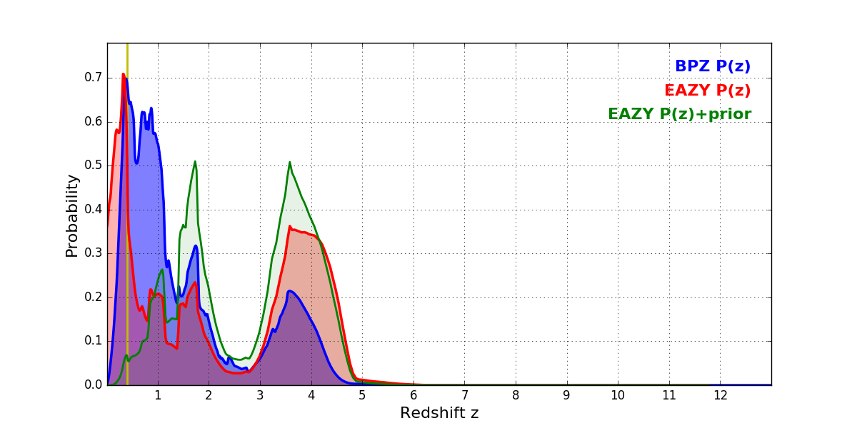 In P(z) plots: Yellow lines mark the cluster redshift z = 0.396,