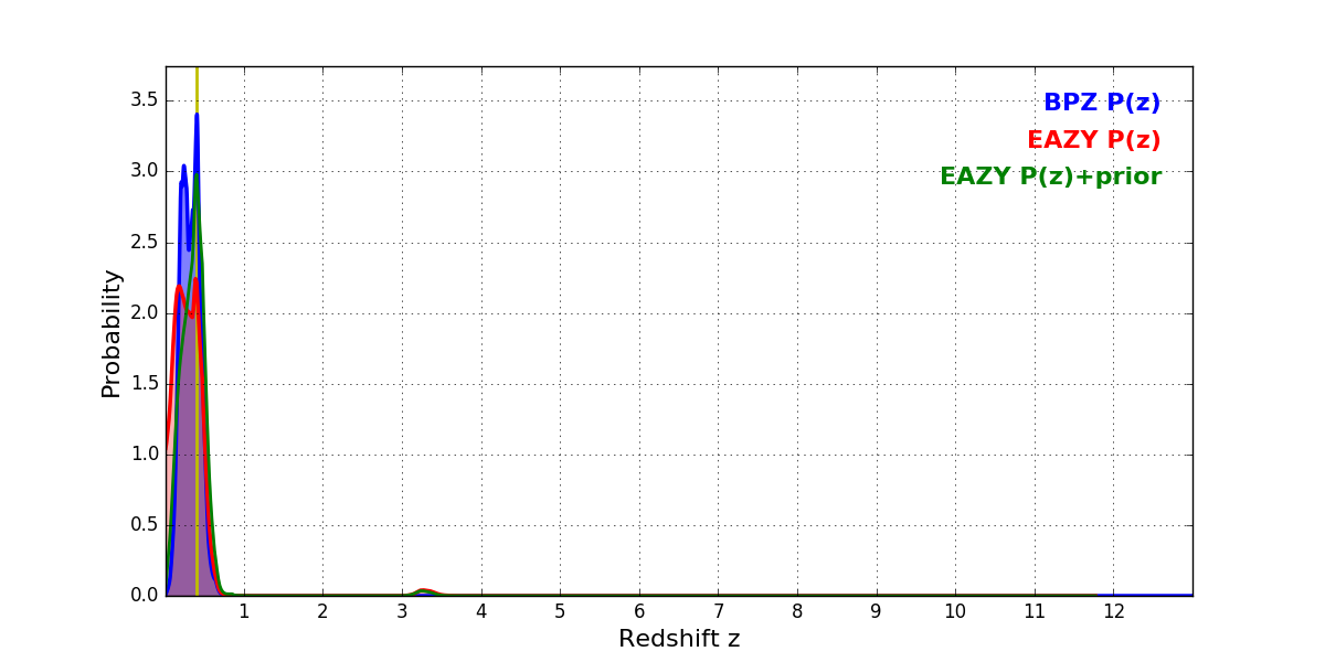 In P(z) plots: Yellow lines mark the cluster redshift z = 0.396,