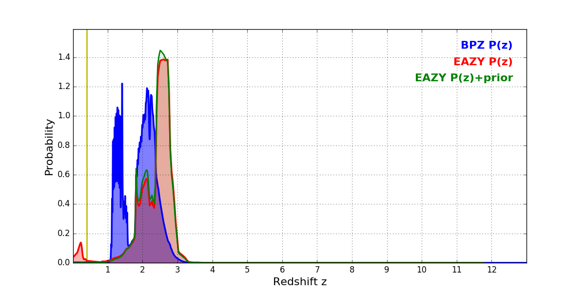In P(z) plots: Yellow lines mark the cluster redshift z = 0.396,