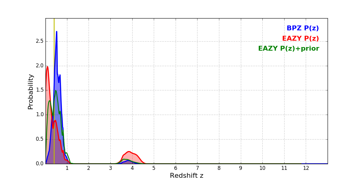 In P(z) plots: Yellow lines mark the cluster redshift z = 0.396,