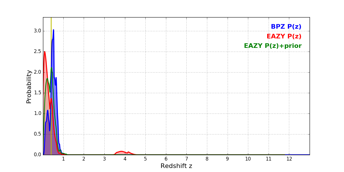 In P(z) plots: Yellow lines mark the cluster redshift z = 0.396,