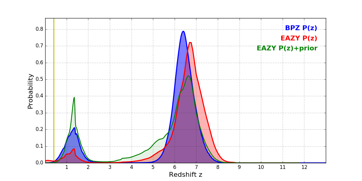 In P(z) plots: Yellow lines mark the cluster redshift z = 0.396,