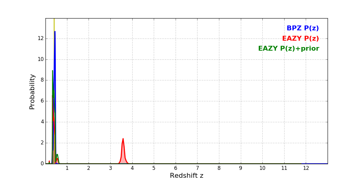 In P(z) plots: Yellow lines mark the cluster redshift z = 0.396,