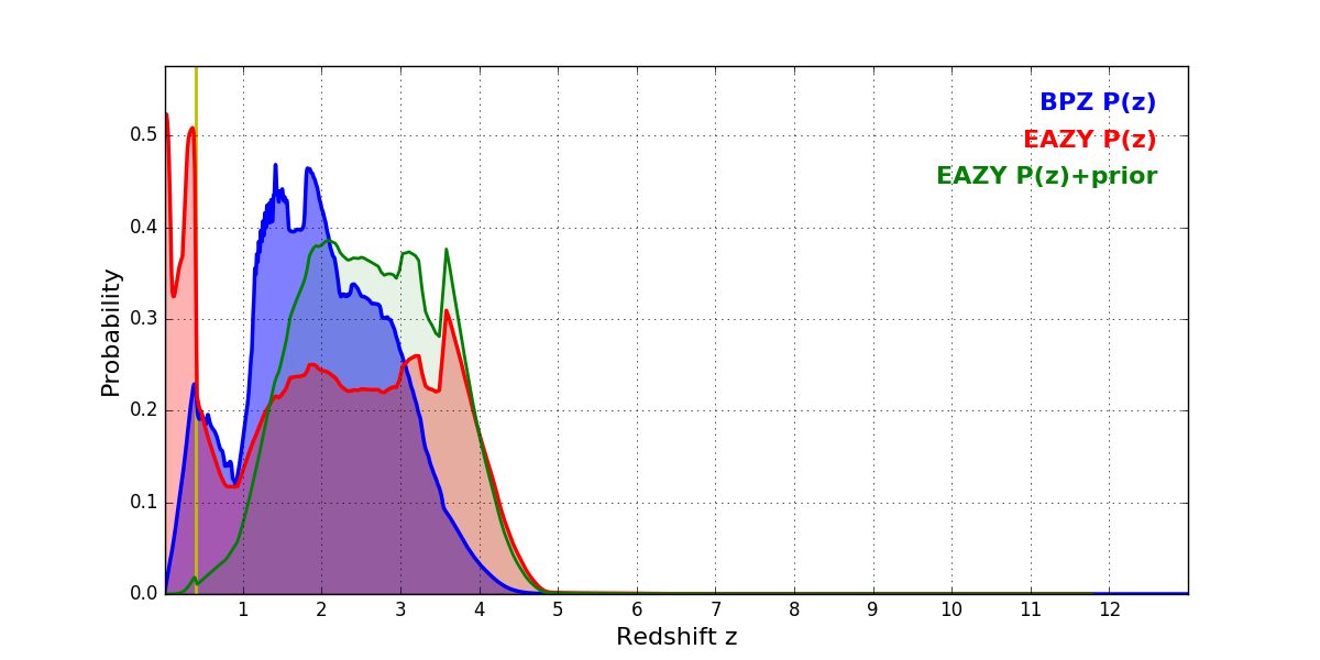 In P(z) plots: Yellow lines mark the cluster redshift z = 0.396,