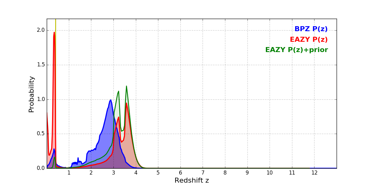 In P(z) plots: Yellow lines mark the cluster redshift z = 0.396,