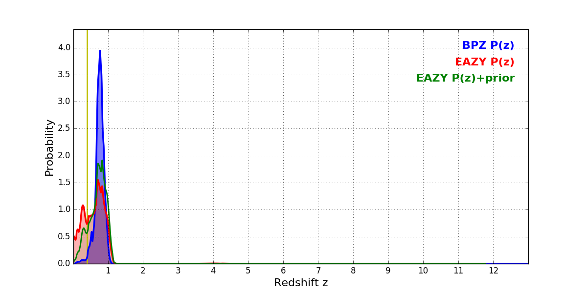 In P(z) plots: Yellow lines mark the cluster redshift z = 0.396,