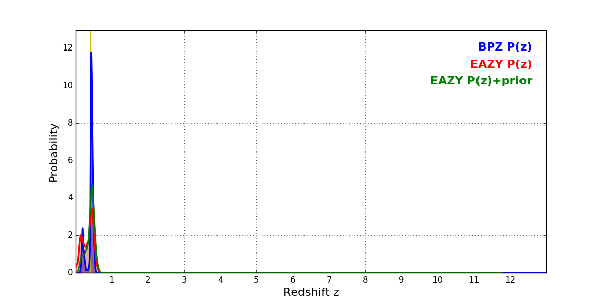 In P(z) plots: Yellow lines mark the cluster redshift z = 0.396,