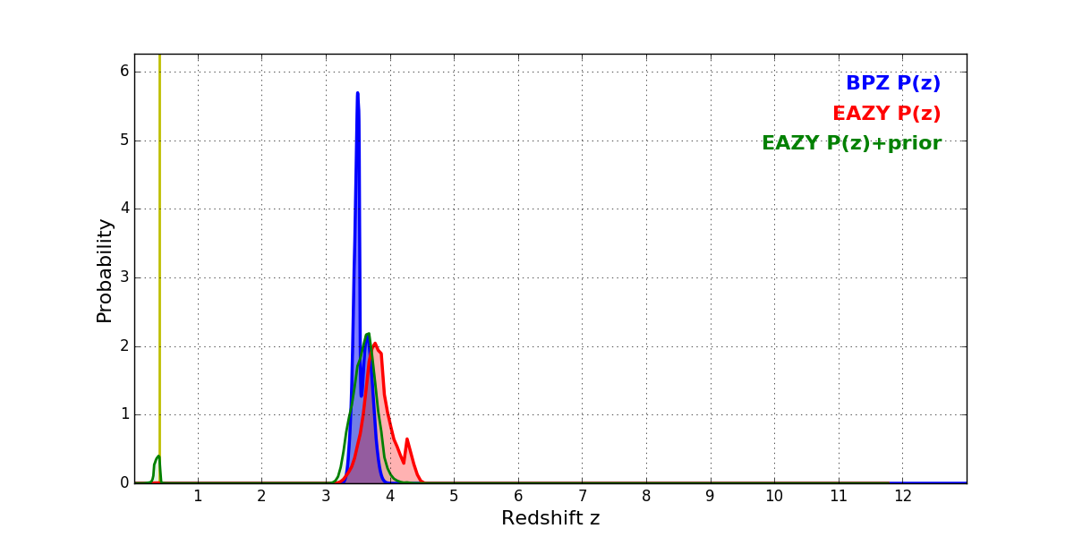 In P(z) plots: Yellow lines mark the cluster redshift z = 0.396,