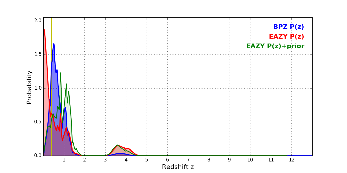 In P(z) plots: Yellow lines mark the cluster redshift z = 0.396,