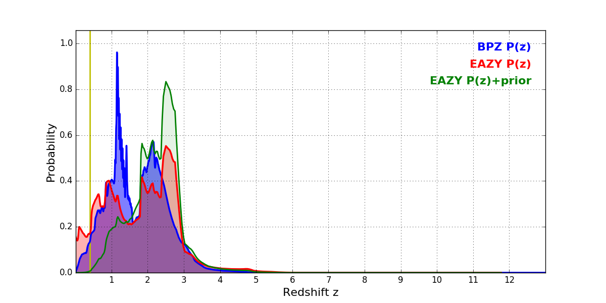 In P(z) plots: Yellow lines mark the cluster redshift z = 0.396,