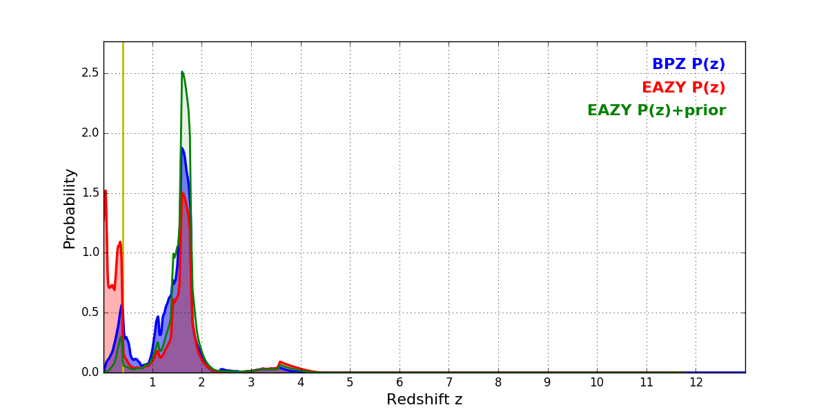 In P(z) plots: Yellow lines mark the cluster redshift z = 0.396,