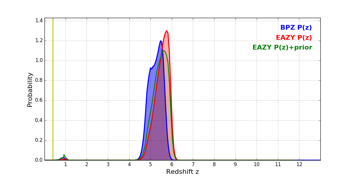 In P(z) plots: Yellow lines mark the cluster redshift z = 0.396,
