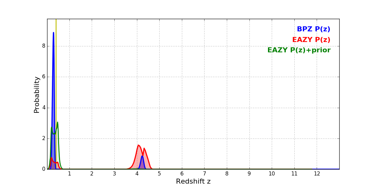 In P(z) plots: Yellow lines mark the cluster redshift z = 0.396,