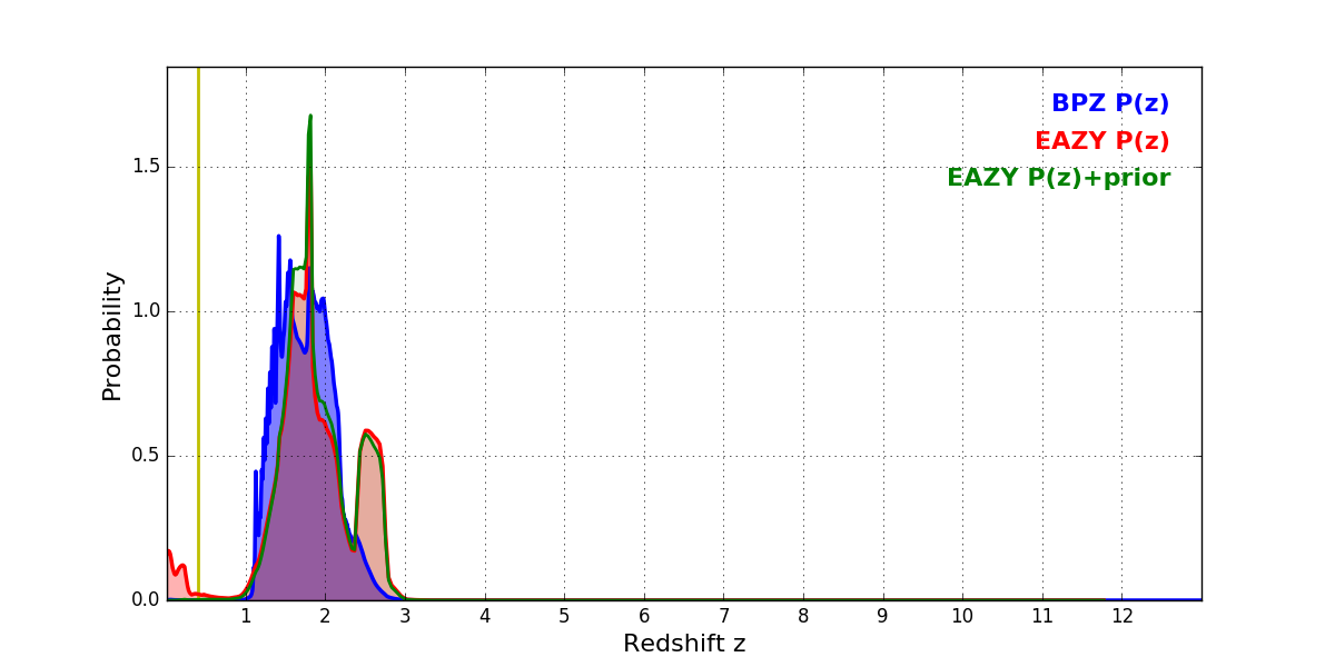 In P(z) plots: Yellow lines mark the cluster redshift z = 0.396,