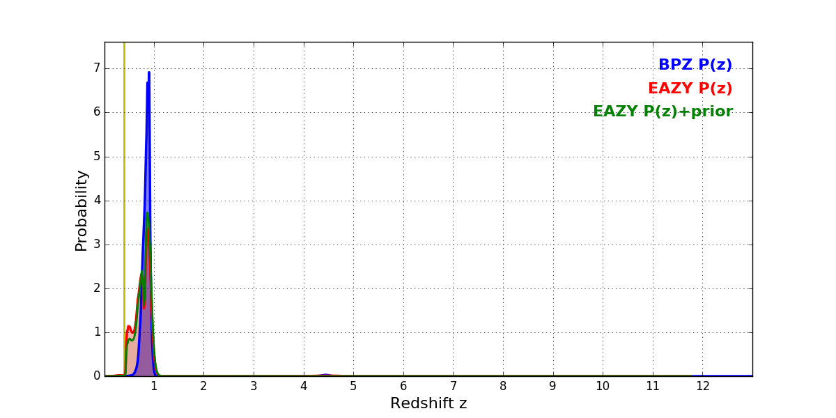 In P(z) plots: Yellow lines mark the cluster redshift z = 0.396,