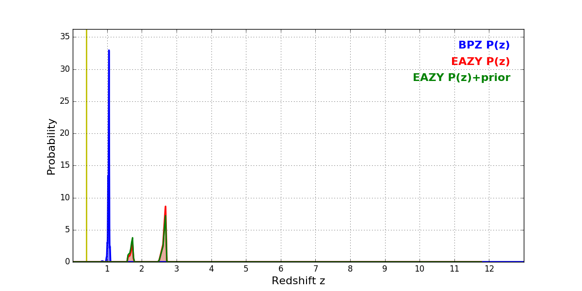 In P(z) plots: Yellow lines mark the cluster redshift z = 0.396,