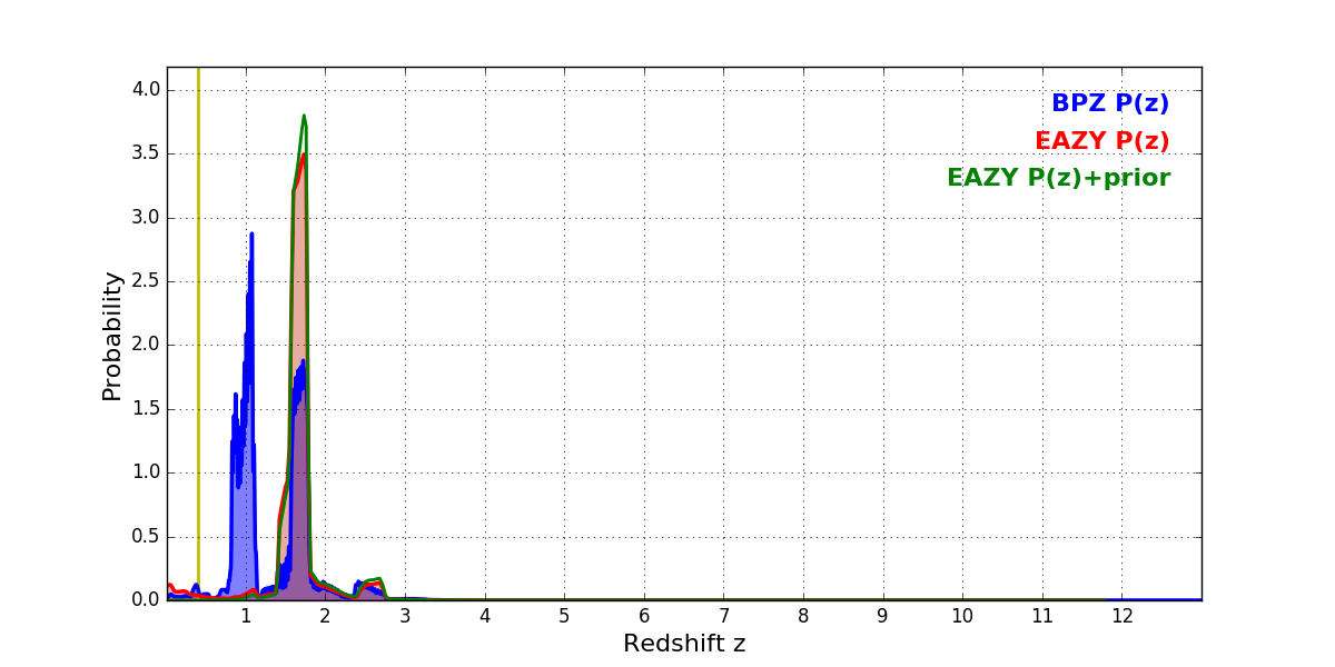 In P(z) plots: Yellow lines mark the cluster redshift z = 0.396,