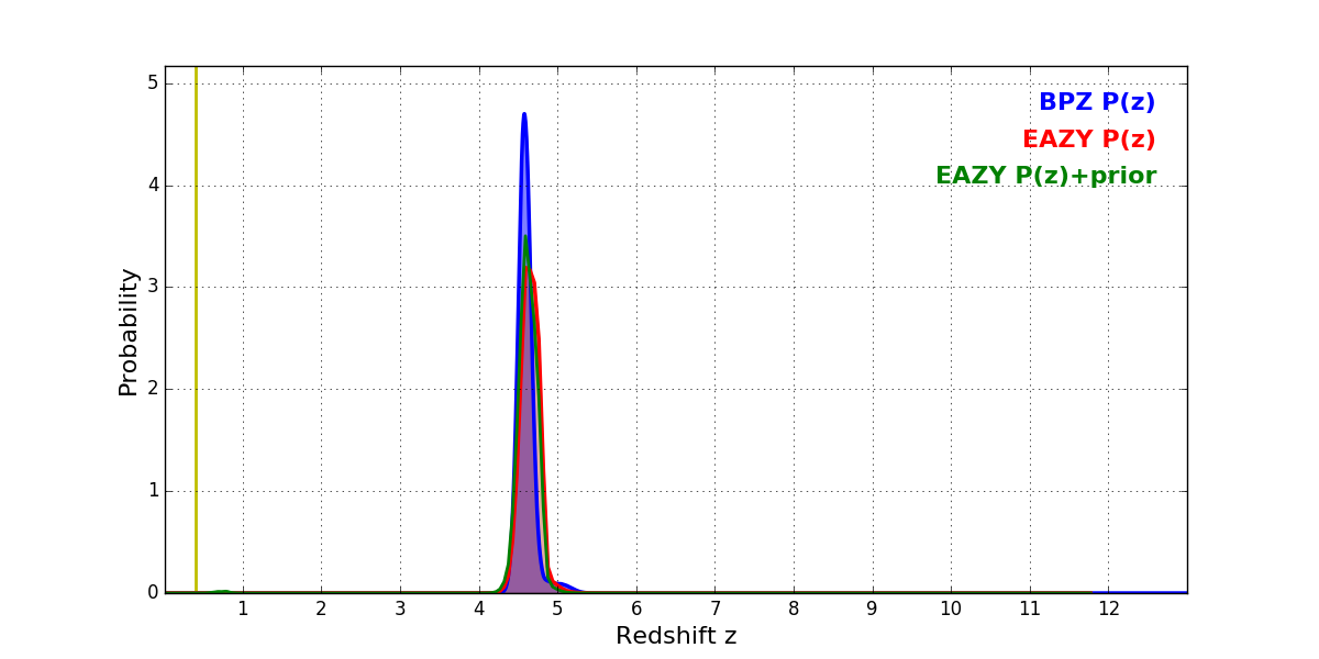 In P(z) plots: Yellow lines mark the cluster redshift z = 0.396,