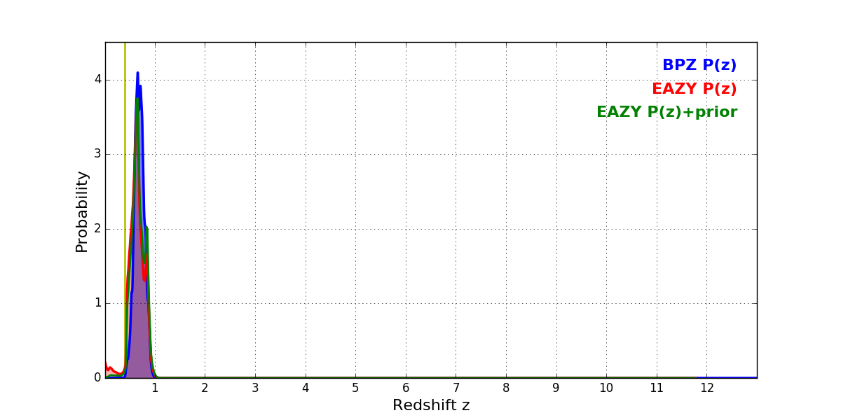 In P(z) plots: Yellow lines mark the cluster redshift z = 0.396,