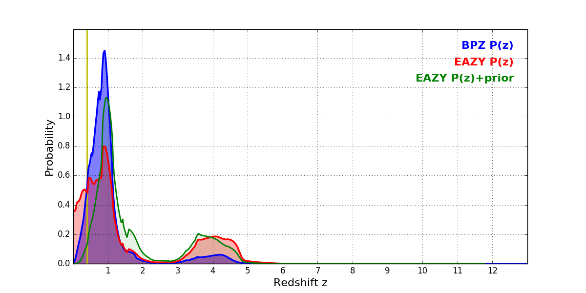 In P(z) plots: Yellow lines mark the cluster redshift z = 0.396,