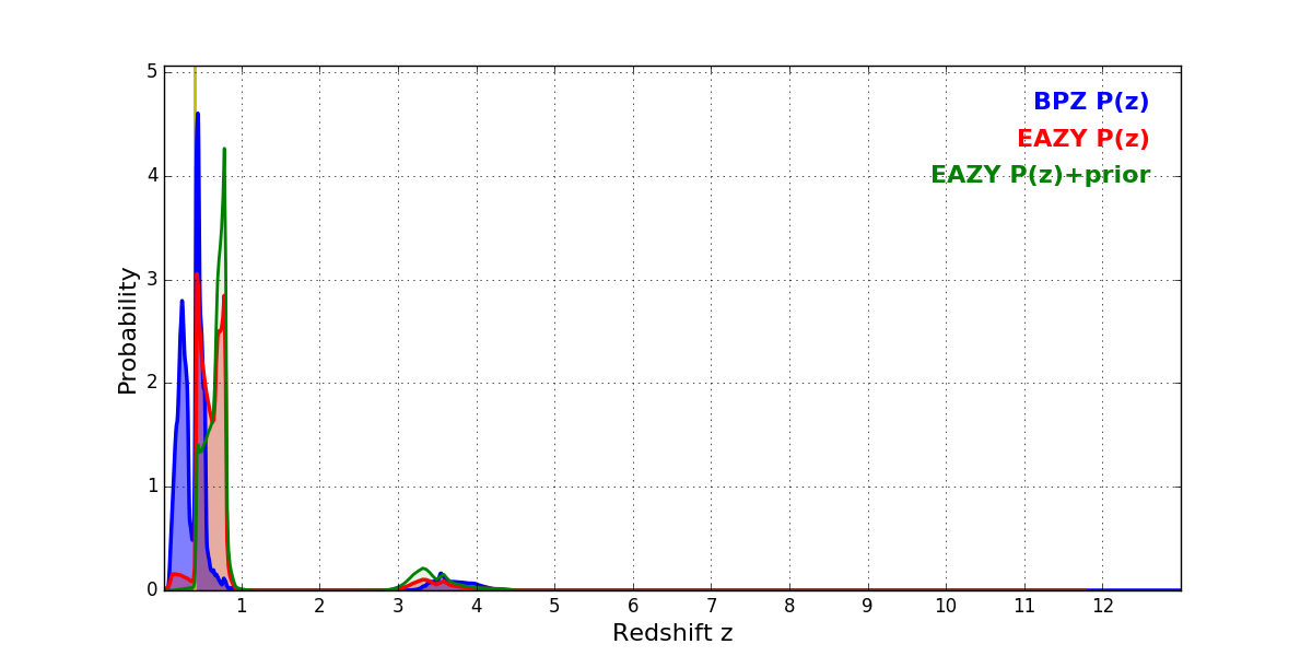 In P(z) plots: Yellow lines mark the cluster redshift z = 0.396,
