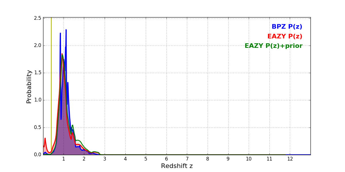 In P(z) plots: Yellow lines mark the cluster redshift z = 0.396,