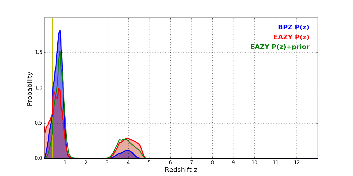 In P(z) plots: Yellow lines mark the cluster redshift z = 0.396,