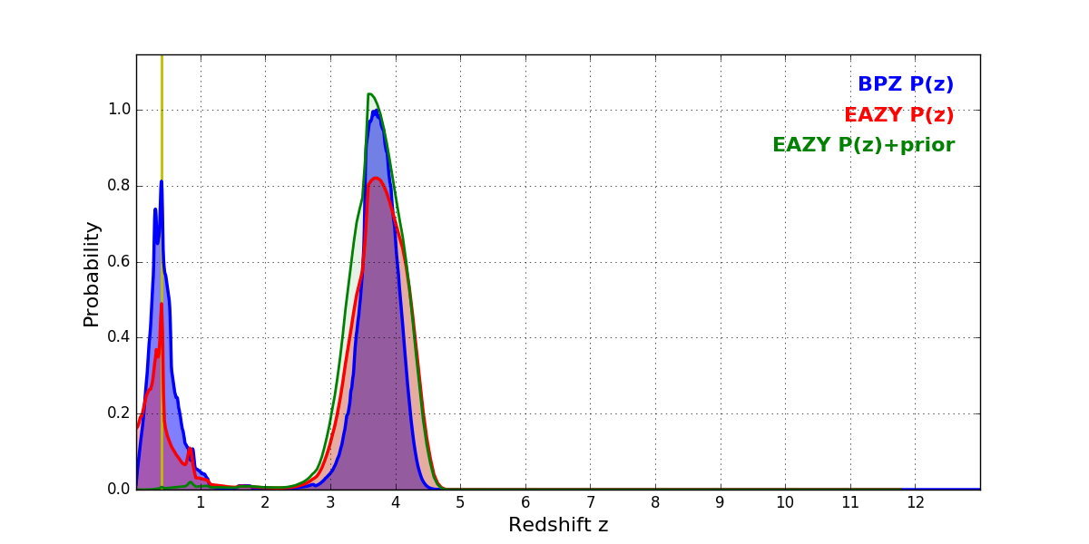 In P(z) plots: Yellow lines mark the cluster redshift z = 0.396,