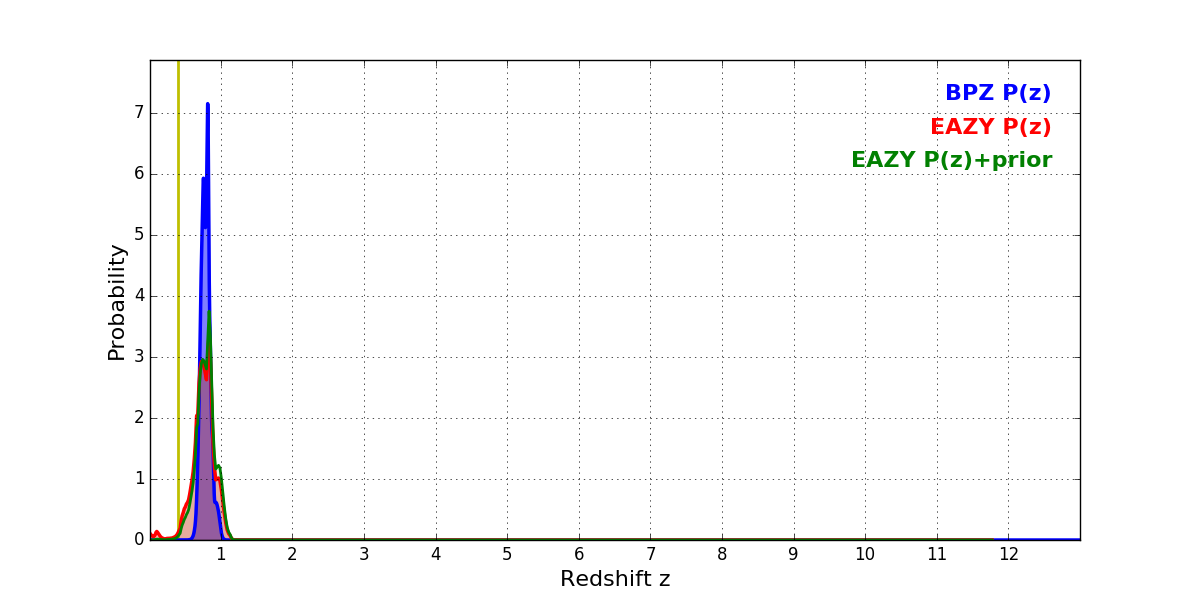 In P(z) plots: Yellow lines mark the cluster redshift z = 0.396,