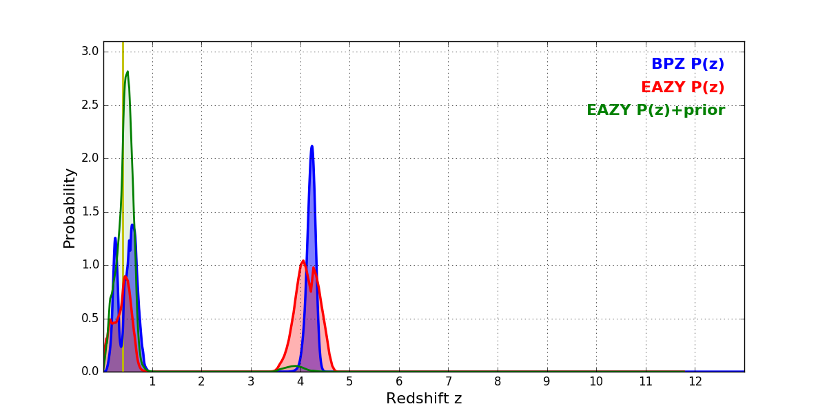 In P(z) plots: Yellow lines mark the cluster redshift z = 0.396,