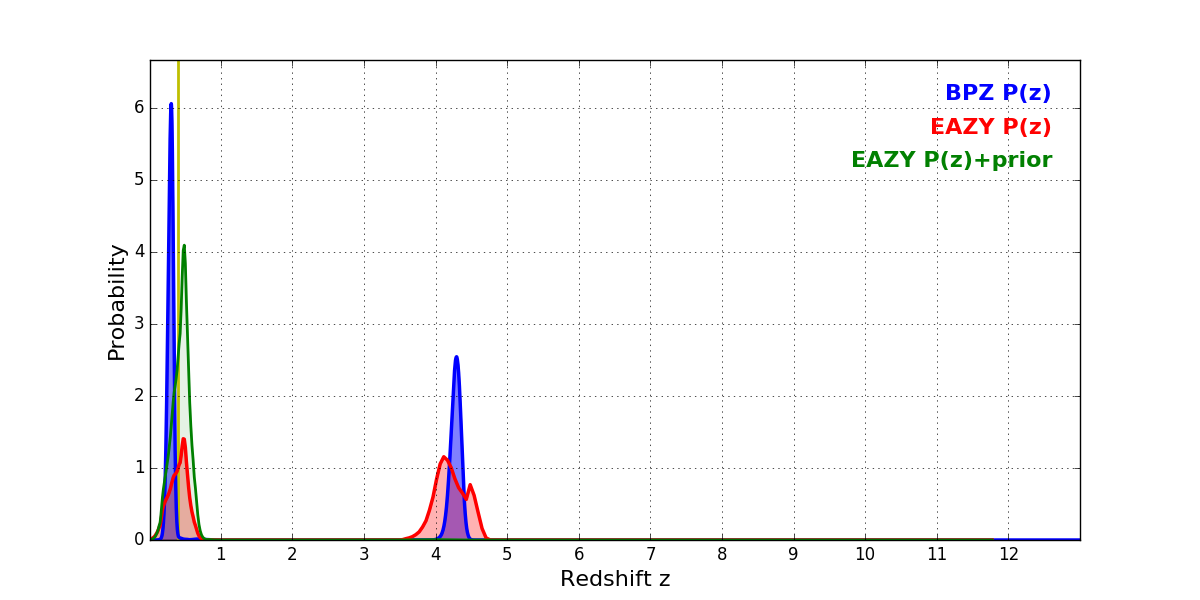 In P(z) plots: Yellow lines mark the cluster redshift z = 0.396,