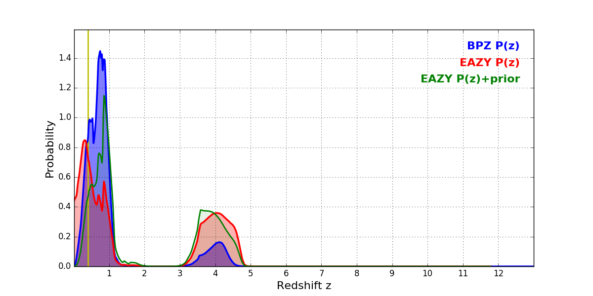 In P(z) plots: Yellow lines mark the cluster redshift z = 0.396,