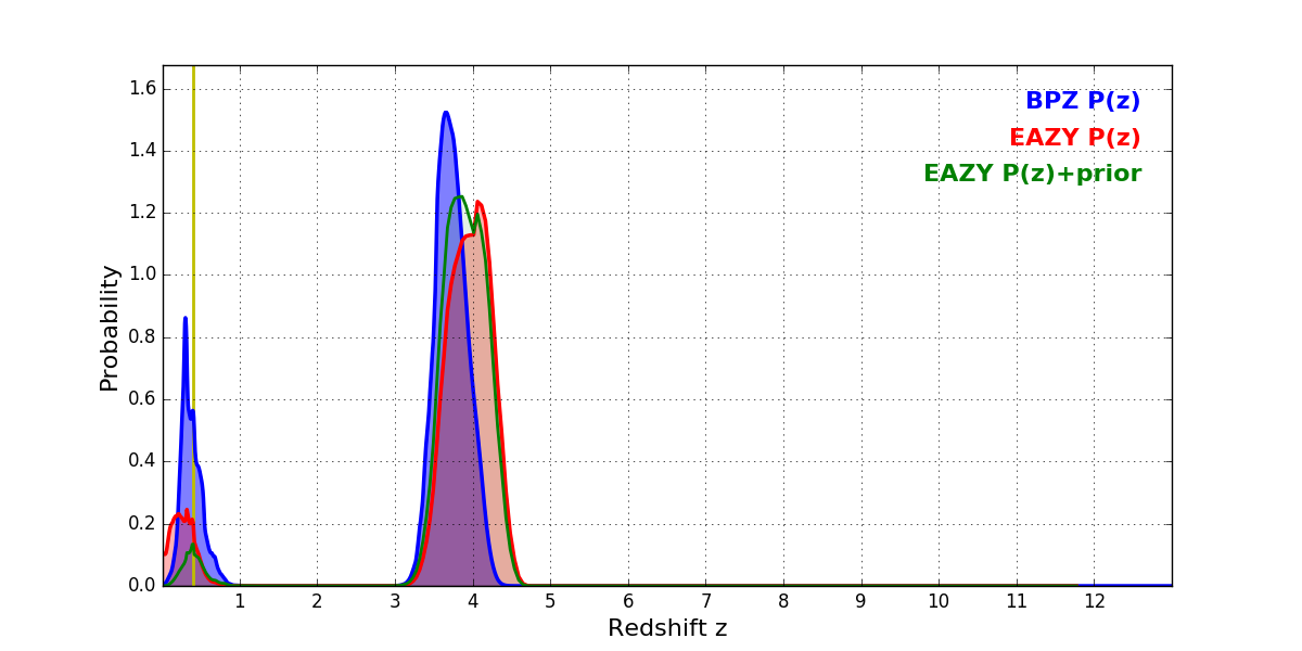 In P(z) plots: Yellow lines mark the cluster redshift z = 0.396,