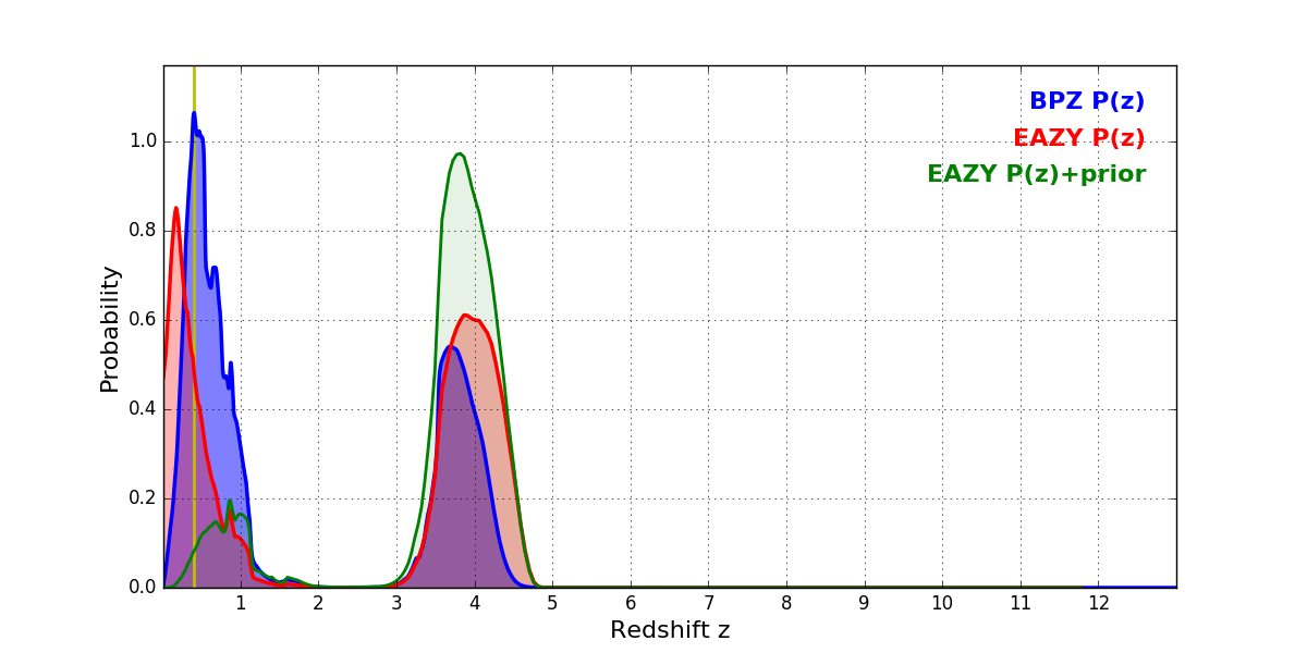 In P(z) plots: Yellow lines mark the cluster redshift z = 0.396,
