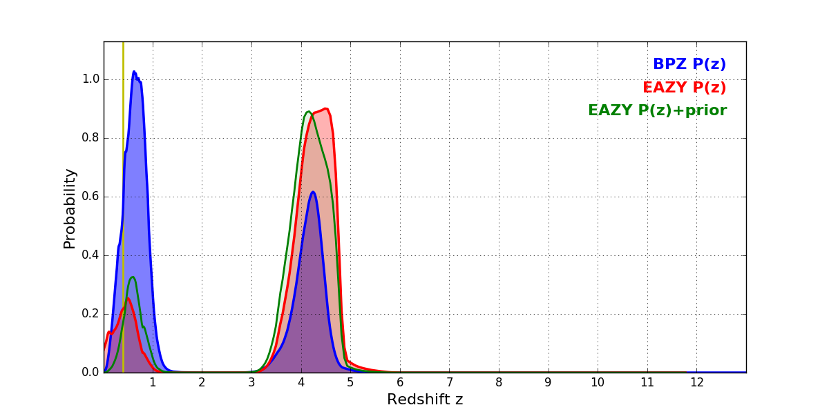In P(z) plots: Yellow lines mark the cluster redshift z = 0.396,