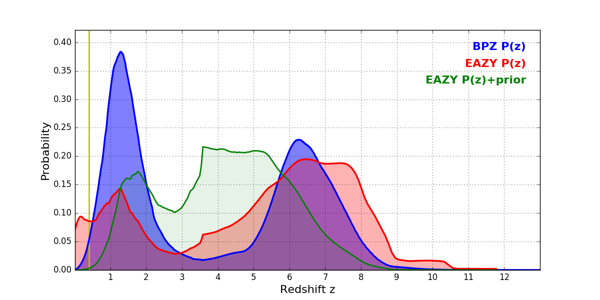 In P(z) plots: Yellow lines mark the cluster redshift z = 0.396,