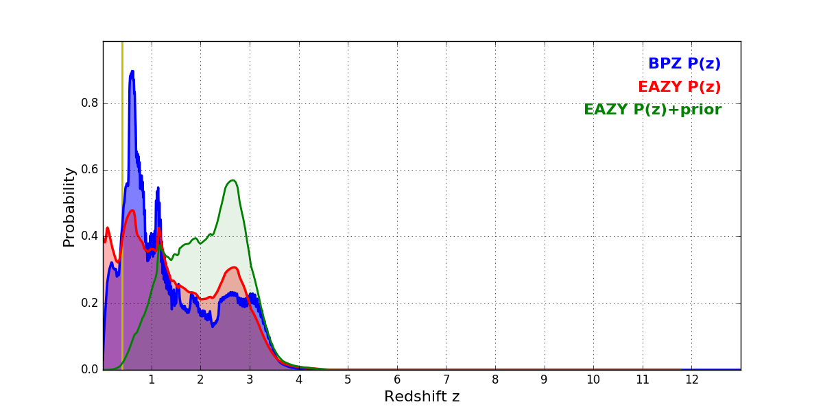 In P(z) plots: Yellow lines mark the cluster redshift z = 0.396,