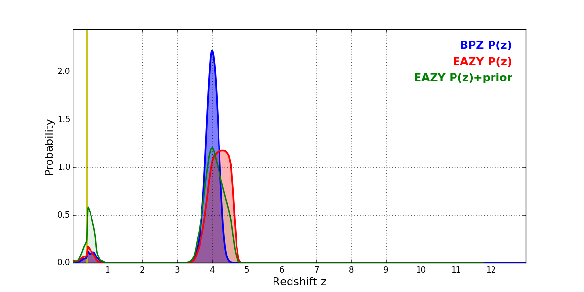 In P(z) plots: Yellow lines mark the cluster redshift z = 0.396,