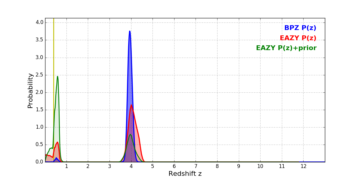 In P(z) plots: Yellow lines mark the cluster redshift z = 0.396,