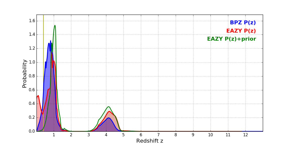 In P(z) plots: Yellow lines mark the cluster redshift z = 0.396,