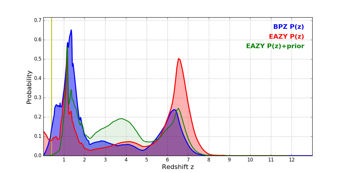 In P(z) plots: Yellow lines mark the cluster redshift z = 0.396,