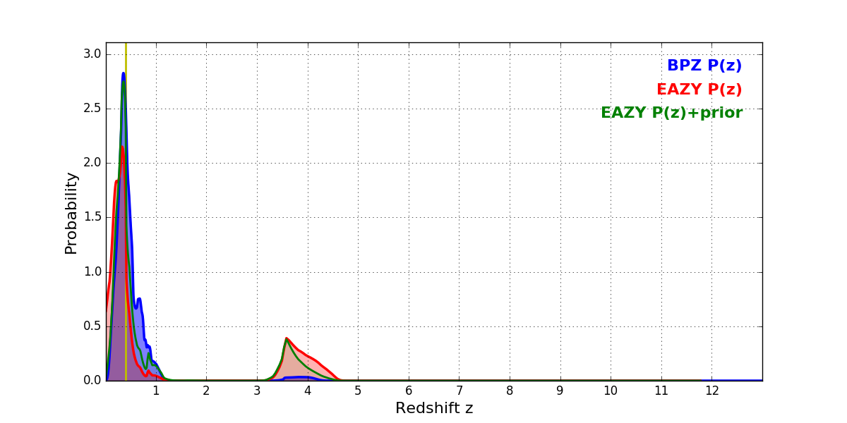 In P(z) plots: Yellow lines mark the cluster redshift z = 0.396,