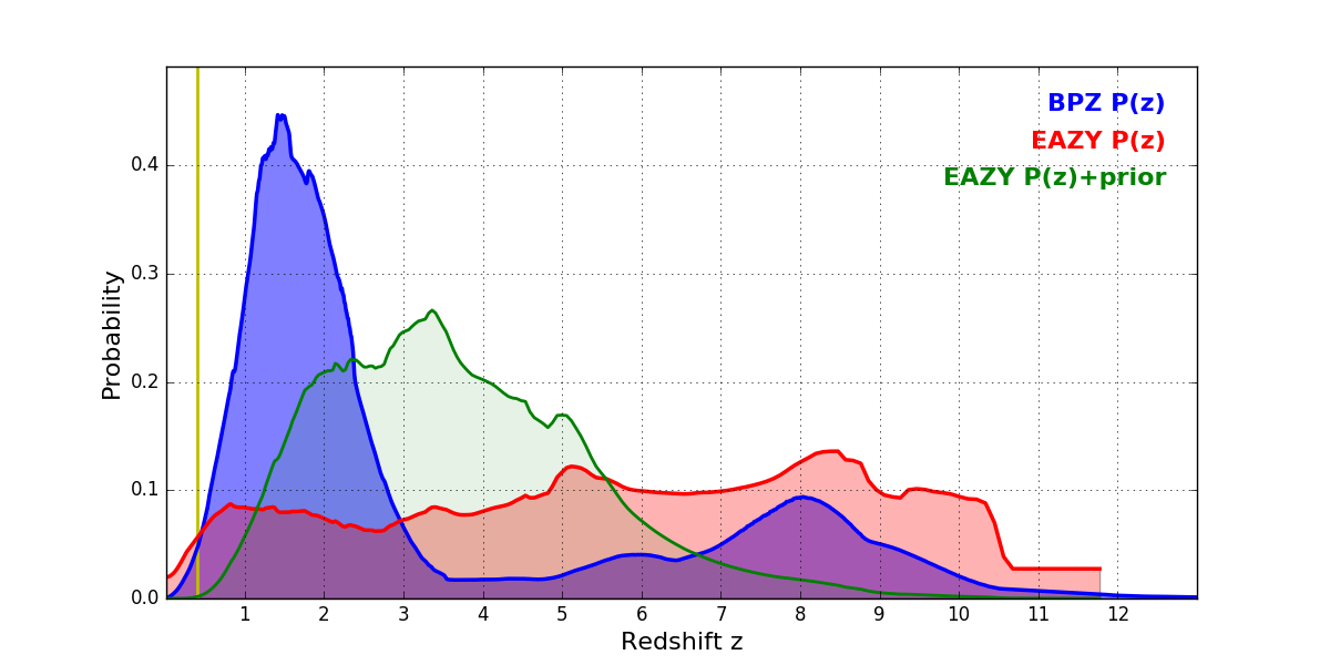 In P(z) plots: Yellow lines mark the cluster redshift z = 0.396,