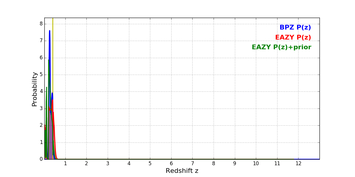 In P(z) plots: Yellow lines mark the cluster redshift z = 0.396,